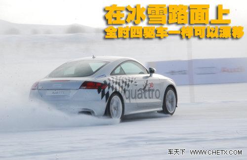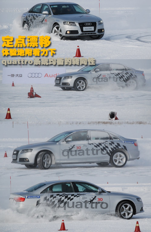 自周杰伦主演的电影《头文字D》播出后,“漂移”这个起源于赛车的专业驾驶技术就被炒得火热。在大部分人的脑海中,好像只是后轮驱动的汽车能够漂移,在我们这次的试驾中,我要告诉大家的是,搭载quattro全时四驱系统的车型同样也可以漂亮的漂移!因为quattro在正常行驶的状态下按40:60动态扭矩分配前后轴动力,并且最高可以进行20的比例改变,这一偏向后轴扭矩输出的特性以及均衡的转向特性、车辆良好的巡迹性让四驱车在冰雪路面上漂移更容易。