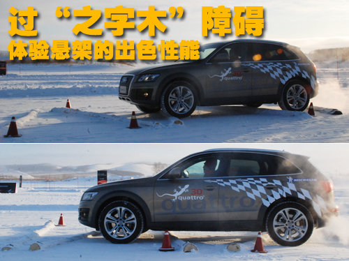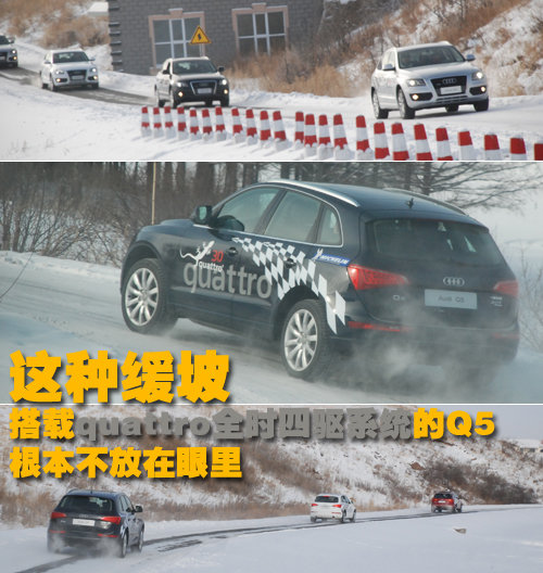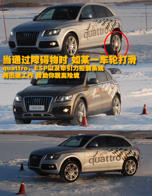 在冰天雪地的环境下,搭载奥迪quattro全时四驱系统的Q5以及Q7可以在某一车轮打滑的情况下,立刻由“托森”中央差速器分配扭矩给没有打滑的车轮并且ESP以及牵引力控制系统同时启动,在极短的时间内让你轻松脱离险境。并且在起步以及上坡时可以让车辆保持稳定,并且保持足够的扭矩。