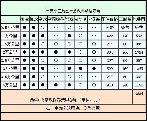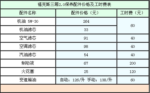 2.2、福克斯三厢2.0常规保养费用