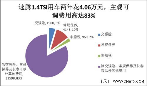 小编还做了一个统计,在正常用车的情况下,除了车船税、常规保养以及交强险(以当前轿车950元算)外,剩下的所有养车费用都可以由车主自己选择,以速腾1.4TSI手动挡为例,车主自由掌控的费用占绝大部分,请看下图: