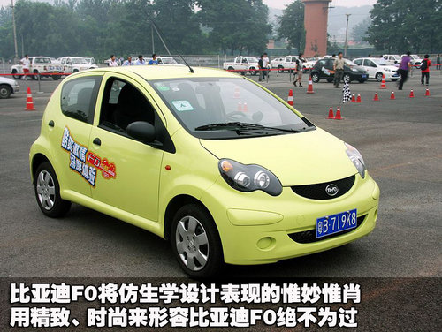 比亚迪F0的外观设计的很卡通,让本身就圆润的前脸显得胖嘟嘟的,第一眼就让人觉得可爱亲切。而尾箱采用了全玻璃制造,很时尚。动力方面,F0并不强势, 直列三缸BYD371QA发动机只有1.0L的排量,最大功率为50KW,最大扭矩只有90N/m,并且要到4000转时才能达到。F0的亮点在于搭载了BOSCH节油控制系统,可以将百公里经济油耗降低到只有4.2升。