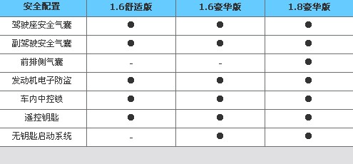 安全方面,搭配了正副驾驶座安全气囊、ABS、EBD等配置的舒适版车型已足够满足安全方面的保障,1.8L车型上则增加了前排侧气囊。豪华车型还增加了无钥匙启动配置。