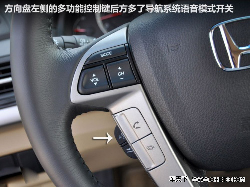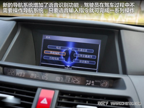 2011款雅阁内饰最明显的变化就是采用了全新木纹的桃木饰条,同时方向盘部分位置也加入了桃木装饰条。另外之前仅有高配车型可选的黑色内饰在2011款中2.4EXL-N也可以选择。在配置上,原有的GPS导航功能进行了进一步升级,追加了交通信息显示和语音识别功能。
