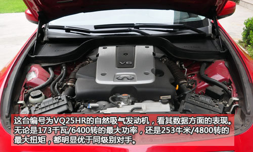 英菲尼迪G25搭载了著名的VQ系列发动机,排量为2.5升,构造为V型6缸。但它不同于日产天籁(报价 参数 图片 论坛)上的那台2.5升发动机,其动力指标还是比天籁的2.5升V6高了50马力和21牛·米。这要归功于像CVTCS连续可变气门正时技术以及气门挺杆无氢碳晶涂层等英菲尼迪的先进发动机技术。当然,G25的发动机与G37相比还是有明显差距的,功率少了足足28%,因此在输出方面我们并没有指望它能有多么强悍的加速表现。