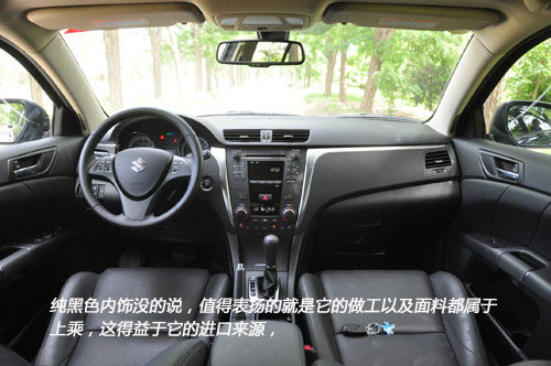纯黑色内饰没的说,值得表扬的就是它的做工以及面料都属于上乘,这得益于它的进口来源,它是由日本静冈县相良工厂负责生产,原装进口的内饰工艺显得很有档次,很好的塑造了铃木在中型车市场的形象,很对一些追求进口品质消费者的胃口。
