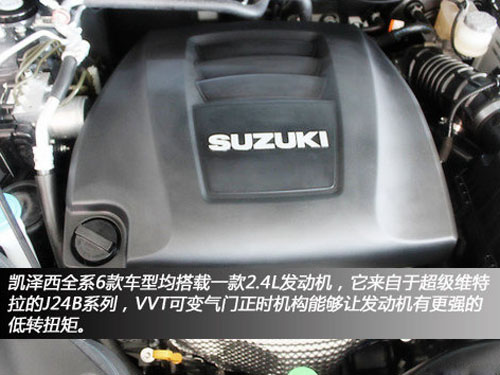 凯泽西全系6款车型均搭载一款2.4L发动机,它来自于超级维特拉(报价 参数 图片 论坛)的J24B系列,铝合金材质减轻了重量,能够获得更理想的轴荷分配,VVT可变气门正时机构能够让发动机有更强的低转扭矩,2500转/分时就能爆发出超过200Nm的扭矩,最大扭矩则在4000转/分时获得,而在6500转/分时能够爆发最大功率131kW(178马力)。