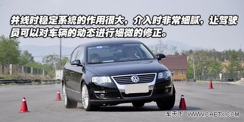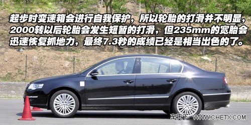 尽管235mm的固特异轮胎让迈腾拥有了很高的稳定性,但是车身的动态始终给人的感觉有些发死。尤其是当我们进行绕桩测试时,悬挂的支撑能力有些不够,车身的侧倾也有些偏大,而且明显感觉到车头与车尾之间并非完美的协调一致,车尾明显要比车头节奏慢上一拍,很难达到步伐一致,而在极限状况下,严重推头的情况也时常出现。其实这种情况发生在迈腾身上也是可以理解的,作为一款带有商务风格的精英座驾,它的终极使命并不是帮你找乐子,而是考虑的如何舒适、快捷、安全的把你从甲地送到已地,所以在底盘的调教上还是以舒适平和为主。而大众一贯的稳定风格也在迈腾身上发挥的淋漓尽致,其实对于一般的驾驶者来说,沉稳往往比灵活更容易掌握,也更安全。