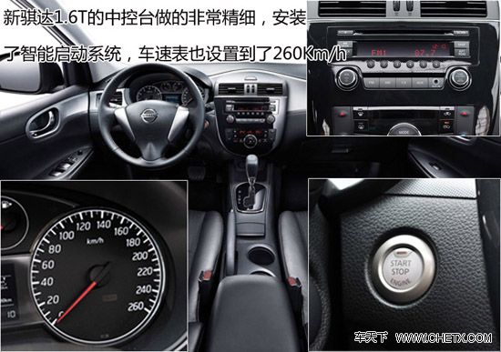 新骐达的中控设计与外观相统一,仍然是以流畅圆润的线条为主。车内的做工和用料并没有明显的提升,整体表现在同级车中依然处在中上等水平。新骐达1.6T在细节的做工上有了很大的改变,采用了以往以来天籁(报价 参数 图片 论坛)和高配轩逸(报价 参数 图片 论坛)才使用的一键启动按钮,中控台的按键布局也更加合理、规整。更加意想不到的是车速表的表底已经标出了260Km/h的最高速度,令人非常期待它的动力表现。