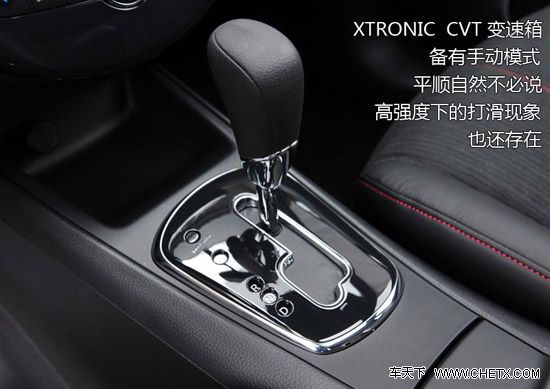 变速箱方面我们稍微熟悉一些,采用副变速器技术的CVT变速箱还被使用在日产的玛驰(报价 参数 图片 论坛)和新阳光(报价 参数 图片 论坛)这两款车型上,相信这也是日产未来在华的一个主要产品。1.6T车型的变速箱配备手动模式,能够丰富人们日常生活中的驾驶乐趣,但是在高强度行车条件下还是会发生打滑的情况。