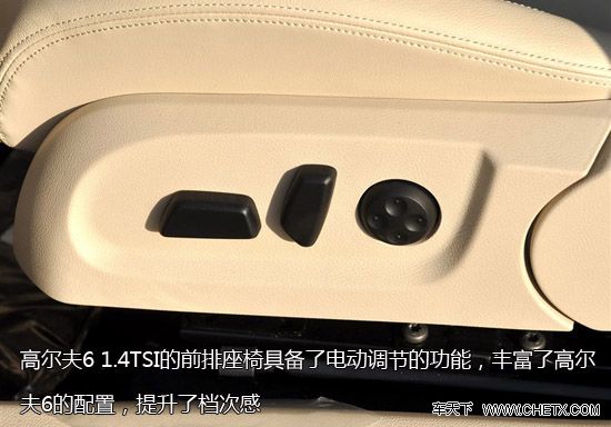 高尔夫6 1.4TSI则在前排配备了电动座椅调节,一定程度上方便了驾驶员的操作,也使整个车辆配置提高了一个档次。