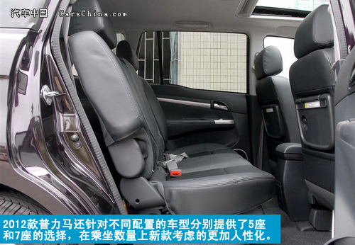 2012款普力马在动力方面的选择还是有些局限性,但在5座和7座的选择上表现的比较人性化。1.6L和1.8L发动机从动力参数上看差距很小,对于家用车来说,如果您不介意手动挡的话,我觉得1.6L手动开拓版7座是最为合适的。