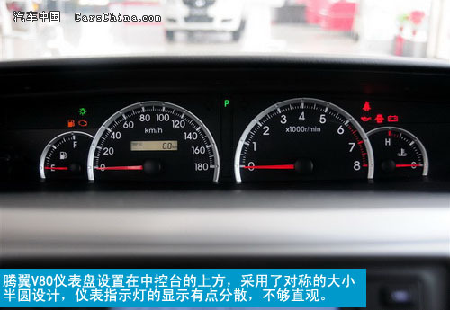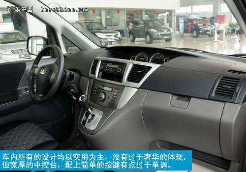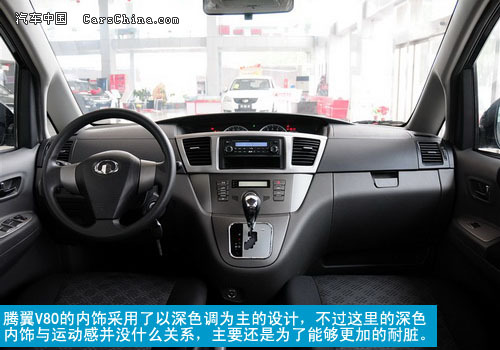 腾翼V80的内饰采用了以深色调为主的设计,不过这里的深色内饰与运动感并没什么关系,主要还是为了能够更加的耐脏。车内所有的设计均以实用为主,没有过于奢华的体现,但宽厚的中控台,配上简单的按键有点过于单调。