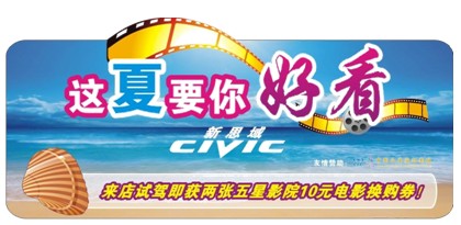 活动一:思域这夏要你好看。自即日起至9月30日,到东风本田深圳各4S店试驾即可获得两张福田嘉信茂广场中影今典国际影城五星影院电影10元(报价 参数 图片 论坛)兑换券,凭券可10元看暑期大片!炎炎夏日,试驾就能看大片,你是否已经心动?快快到东风本田深圳各4S店参加试驾活动吧!先到先得,送完即止。