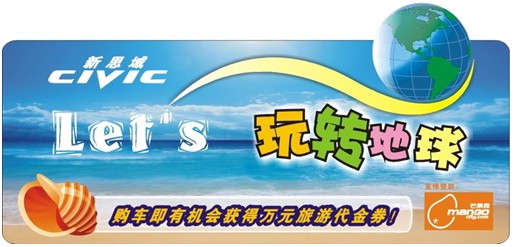 活动二:思域Let’s玩转地球。自即日起至9月30日,到东风本田深圳各4S店购车,均有获得抽取50元、300元、1000元、10000元的芒果网旅游代金券的机会。该代金券可抵用芒果网订购的各种旅游套餐费用,欢乐假期,用东风本田芒果网旅游代金券,旅游更开心。