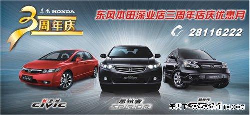 [车天下 深圳讯]全国十佳的东风本田深业店即将在本月28日迎来开业三周年的大喜之日,深业东本从11月起将陆续推出覆盖销售、维修保养、客户服务的一系列优惠活动,回馈感恩三年以来一直支持我们的各位车主朋友们。