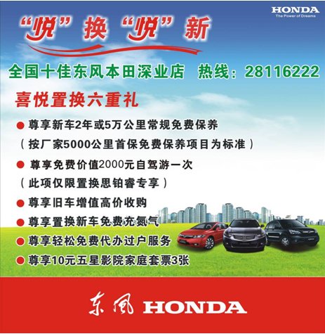 ●店庆期间置换购买东风本田任意车型,即可获得新车2年或5万公里免费保养;