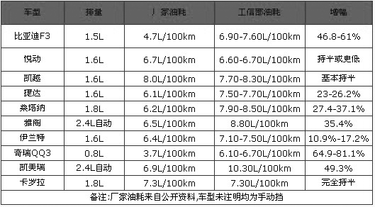 在工信部最近公布的车型油耗中,去年十大畅销车型的数值大多高于厂家公布的理论油耗,其中,奇瑞QQ3(报价 参数 图片 论坛) 0.8L最多高出八成有余,不过,也有三款车的油耗与其厂家数据基本吻合,一款悦动(报价 参数 图片 论坛)的数值甚至还低于厂家油耗水平。