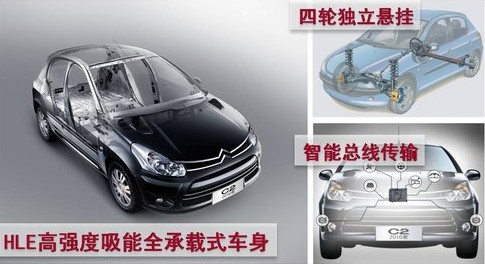 同时,C2诸多与生俱来的优点也在2010款车型中得到了很好的继承。HLE高强度吸能全承载式车身、四门防撞杆、可溃缩式转向柱、ABS+EBD、前排双气囊等装备,让行车更加安全可靠;而智能总线传输(CAN-BUS)、大灯延迟熄灭“伴我回家”、紧急制动频闪、遥控中央门锁、行车自动落锁、人性化声音警告信号以及助力转向等多种高科技功能更是极大地提高了使用的舒适性。同级车中罕见的四轮独立悬挂更是让C2具有了更强的操控优势,三角式麦弗逊型前桥和纵向摆臂式后桥,能有效地衰减因路面不平传递给车身的震动。这些人性化配置不仅提升了驾乘的舒适性,更确保了车辆的主动安全性。