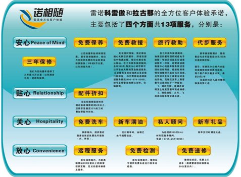 质量、安全、服务,一个都不能少。进口豪华品牌车型的4年10万公里保修、免费保养、免费道路救援、代步车等服务也开始逐渐在其他进口品牌车型上推广。雷诺品牌车型的"诺相随"售后服务除了提供3年10万公里的保修外,还提供3年或6万公里含工时费的免费保养,免费道路救援则是与宝马、奔驰等豪华车品牌一样的蒙迪艾尔;而在斯巴鲁品牌的经销商店,等待车辆修理的客户将可以享受代步车的便利。