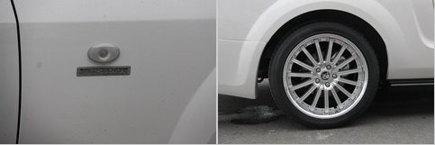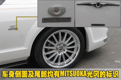 在光冈GALUECONVERTIBLE的车尾部及车侧灯处均有MITSOUOKA即光冈的字母标识,细看的话,轮毂中央位置也会发现。近距离会发现,多轮毂的的在具备强烈的视觉冲击外,细节体现出很高的质感。