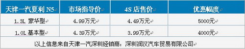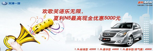 此次最高达到5000元的优惠幅度,使夏利N5的性价比优势凸显,再凭借其在外观、动力、操控、安全和舒适性等方面的优势,夏利N5已经是同级别轿车中的标杆车型,必将成为天津一汽冲击市场的一把利剑。