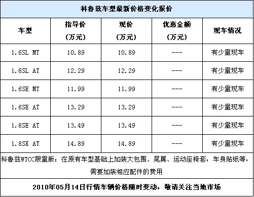 2010年的北京车展就展出了改装后的车型,科鲁兹(报价 参数 图片 论坛)WTCC限量版,实际上,科鲁兹WTCC限量版就是在科鲁兹原版的基础上改装之后出来的更加运动、炫酷的车型。而近日,编辑从科鲁兹广州地区4S店处了解到,科鲁兹WTCC已经有现车在售,售价在原版的指导价基础上加收改装的费用而已,详情请看下表。