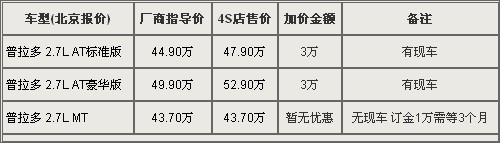 据一汽丰田4S店销售人员介绍,老款国产普拉多目前已停止销售,只有个别经销店还有少量库存车,但在近期也会全面售清。现在在售的普拉多为进口新款2.7L车型,店内有少量白色、绿色现车可供消费者选择,但提现车根据车型需要加价3万元(报价 参数 图片 论坛)。