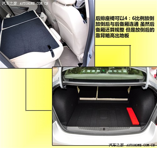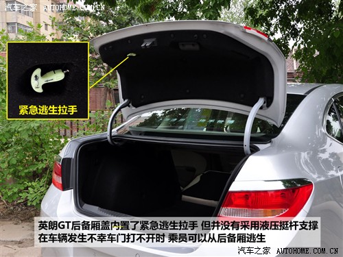 后备厢盖上内置了一个紧急逃生拉手,当车辆因为意外时,乘员拉动扳手即可从后备厢逃生;不过遗憾的是英朗GT后备厢并没有安装液压挺杆;三厢车型承载空间是优势,后排座椅可以以4:6的比例放倒,使后备厢容积得到扩展,方便装载行李,但是放倒后的座椅靠背不是与地板完全的水平结合,有一点凸起。
