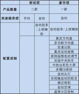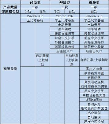 1.6L排量有三个级别,分别是时尚、舒适和豪华,每款车型所对应的产品数量及差别详见下表: