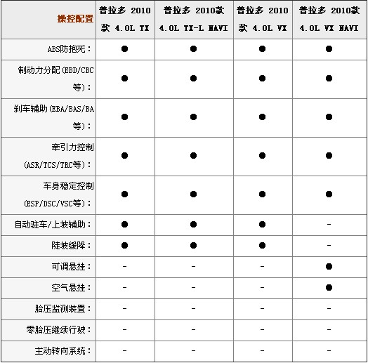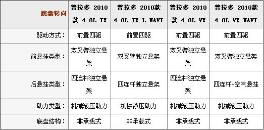 一汽丰田普拉多采用的前双叉式独立悬挂(带稳定杆)/带稳定杆的后四连杆机构式悬挂(最高配车型VXNAVI采用空气悬挂),高配两种车型(VX、VXNAVI)中还加入了KDSS动力调节悬挂系统。