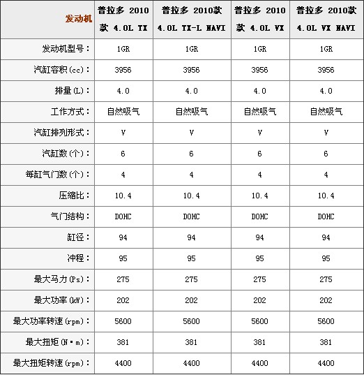 动力方面,新车采用的发动机均为V6型代号为1GR的发动机,排气量为3956mm,最大功率为202kW(275马力)/5600rpm;最大扭矩为381Nm/4400rpm,油箱容积87L,官方公布的百公里油耗(综合工况法)为12.2km/L。