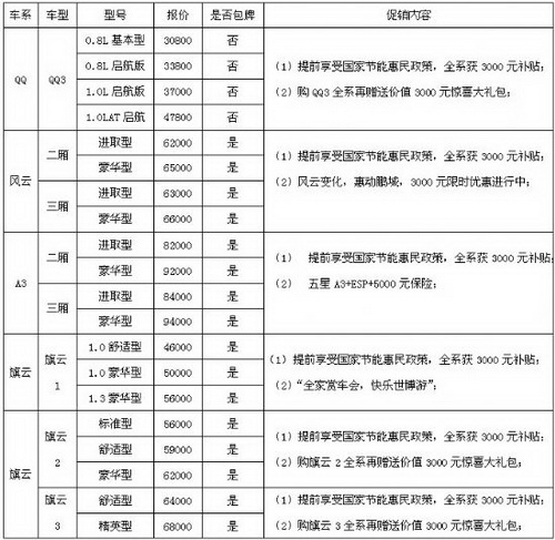 国家“节能减排惠民工程”已经开展,奇瑞汽车部分产品在第一批目录中公告,据悉,奇瑞其他大部分产品也将纳入本次“节能减排惠民工程”中,为充分体现惠民政策,北方奇瑞特开展“奇瑞全系车型,提前享受国家节能惠民政策”,对1.6L以下车型给予终端用户一次性3000元(报价 参数 图片 论坛)价格补贴。