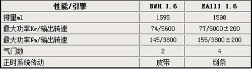 而即将在8月份应用于宝来入门级车型上的EA111系列1.6L机型,具有双顶置凸轮轴、每缸4气门和终身免维护的链条正时传动等优势。而且通过客观数据上的对比,我们能够清楚看出,EA111系列发动机的功率扭矩输出更快也更高。
