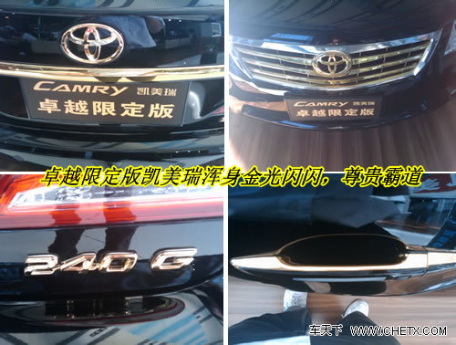 卓越限定版凯美瑞是在原有240G车型的基础上改进而来。企沃丰田给这款车换了不少的装备:配备了前脸的进气隔栅、TOYOTA及CAMRY的标徽以及尾部的装饰条更具高级感的镀金金标,车头金光闪闪确实让人虚荣心得到极大的满足。
