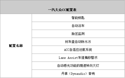 国产版大众CC不仅光外形优美,它也是第一款装备了较高高科技含量技术的国产车型。前大灯带有自动感光、随动转向功能,后备箱摄像头带有折叠功能;智能钥匙、自动泊车、胎压监测等高级车配置国产版大众CC均有配备,刹车盘还带有自动除污水功能;并且ACC自适应巡航系统、LaneAssist车道偏移警示等豪华配置也是第一次装备在国产车型上。