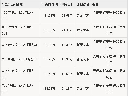 根据现代4S店销售人员介绍,旗下SUV车型ix35销售态势很好,预订人数众较多,但现车到店的速度很快。车型除了按厂商指导价销售以外,还送2000元(报价 参数 图片 论坛)的装饰礼包,所以颜色都可以预订,4S店没有现车,提车需要等待一个月的时间。
