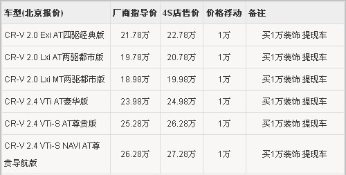 3月5日东风本田正式推出全新的CR-V,分为2.0L及2.4L两种排量,共计六款车型,售价18.98万元-26.28万元,比老款增加了导航版车型,新CR-V在配置方面更加完善。根据网上车市价格监测系统显示,全新上市的CR-V目前加价数额与近几月基本相同,提现车需加装1万元装饰。具体车型售价见下表: