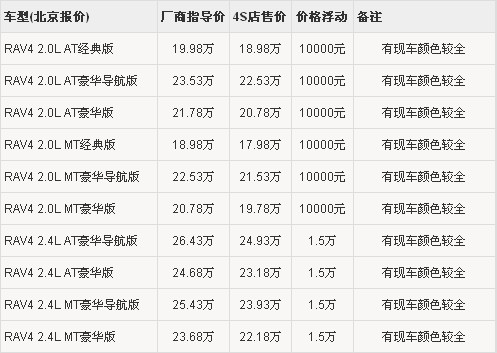 RAV4是丰田公司微型多功能越野车家族中的基本型车。在不断改进的过程中,充分迎合国人的驾车需求,不管是在外形美感上,还是在越野性能上,都很大的程度上超越了同级别对手,获得了越来越多消费者的青睐。根据网上车市价格监测系统显示,一汽丰田RAV4车型最高优惠现金1.5万元。并且在7月1号全新推出了一款2.OL豪华升级版,现已正式接受预定。具体详情如下表: