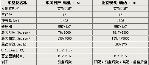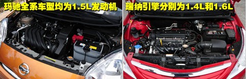 北京现代瑞纳(报价 参数 图片 论坛)搭载的是1.4L和1.6L两款不同的发动机,我们选取的是低排量1.4L的车型与日产玛驰(报价 参数 图片 论坛)车型进行对比(玛驰全系车型均搭载的是1.5L发动机)。两款车型都配备的是直列4缸16气门的引擎。两款车型的动力性能在同级车型中属于中规中矩的,完全可以应对人们的日常需求。至于油耗方面,瑞纳和玛驰的百公里油耗均在6.5个有左右,绝对可以称得上经济省油。瑞纳在1.4L高配车型上配备了前后盘式刹车,低配车型则是前盘后鼓式刹车,玛驰全系车型均是前盘后鼓式刹车。
