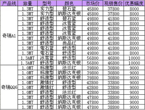 编者从深圳北方奇瑞4S店了解到,由于现款QQ6的替代车型旗云1(报价 参数 图片 论坛)已经上市,因此现款QQ6目前处于最后的清货阶段,截止7月31日,店内限时限量供应一批QQ6的特惠车型,仅剩最后10台车,全部可优惠现金9000元(报价 参数 图片 论坛),颜色以银色和红色为主.另外奇瑞A1(报价 参数 图片 论坛)在深圳车市现车充足,13.MT全系车型优惠8000元,1.3AMT最高可优惠10000元。有兴趣的网友可以到店咨询了解,具体详情请见下表: