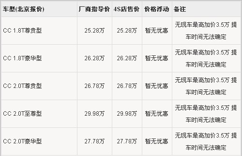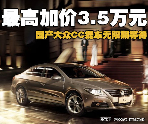 国产的大众CC(报价 参数 图片 论坛)于不久前正式落户一汽-大众,搭载1.8TSI与2.0TSI的国产大众CC售价区间为:25.28-29.98万元(报价 参数 图片 论坛),在价格方面给了我们不小的惊喜。刚上市不久的国产大众CC受到了具有独特品味的消费着追捧,那么目前市场的情况如何呢?在北京市场,国产的大众CC一车难求,最高加价3.5万元。