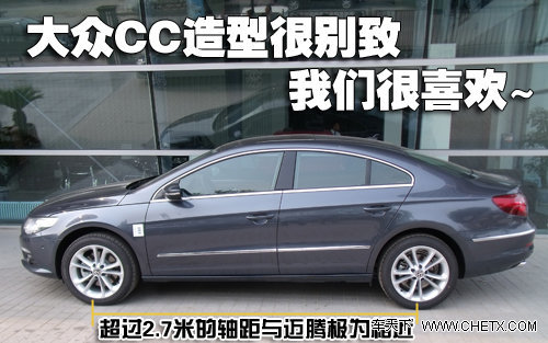 大众CC的外形尺寸是一款标准的B级轿车,不到4.8米的车长、2.7米的轴距都与PQ46平台的迈腾(报价 参数 图片 论坛)极为相近,但是车款方面比迈腾更为宽大。此外通过外形上的线条设计,它的设计师将其变成了一款跑车味儿十足的轿车。