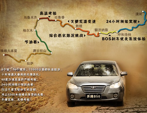 2011款奔腾B50虽刚上市,但验证其卓然品质的性能测试,却于上市之前已进行。今年7到8月的不足20天时间里,2011款奔腾B50进行了一次总行程长达11000多公里,在24小时持续驾驶、BOS刹车优先系统检验、综合恶劣路况挑战、戈壁荒漠竞速、高温考验、节油赛等六大严酷的极限测试项目中,2011款奔腾B50表现出色,顺利过关,其卓越的品质魅力不仅让所有测试者大为赞叹。此次上市见面会上,在极限考验之旅的视频播出以后,所有来宾都为之报以热烈掌声。