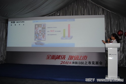 16个写着2011款奔腾B50升级功能的气球衬托着耀目的2011款奔腾B50,其在外观、内饰与配置方面进行了多项优化设计,但依然沿袭了奔腾家族轿跑车底盘、3H高安全车身、四轮独立悬挂系统等同级市场优势明显的产品特征,而奔腾B50长达2675mm轴距的"越级"尺寸更是成为同级车中的"佼佼者"。
