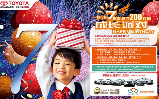 同时,在此次一汽丰田为自己庆贺生日的时候,还别出心裁地推出"寻找小店长"活动。活动面向参与试驾的消费者家庭中6-7岁的儿童,只要是性格开朗、喜欢表演的小朋友都可报名参选,报名时间从2010年11月1日起至2011年1月10日结束,最终当选的"小店长"还将会参与到一汽丰田相关活动中。一汽丰田在回馈新老用户的同时,更为小朋友们提供了一个展示才华与形象的大舞台,一如既往地对孩子们倾注满心的关爱。