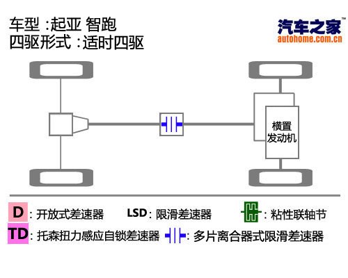智跑的适时四驱系统结构十分简单:中间为多片离合器式差速器结构,前后桥均为普通的开放式差速器,既没有锁止功能,也不能进行轮间扭矩的分配,并且四轮都没有电子刹车辅助系统,这种四驱系统只能让扭矩在前、后桥之间分配,脱困能力较弱。