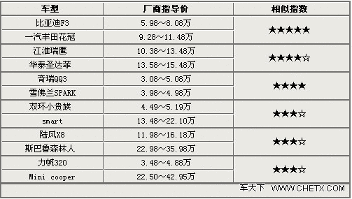 今天我们要为大家介绍6对车型,如表格所示,位于每栏上面的就是效仿之后的成果,而下面的则是原型车。有些车型在效仿之后售价明显比前者要低廉很多,如果设计比较成功的话,的确可以带来不小的收益。而比较失败的车型就没那么好的命了,试问一辆几万的车如何能够与几十万的车抗衡?看上几十万车的人又怎会低头看你这几万元(报价 参数 图片 论坛)的“山寨车”。