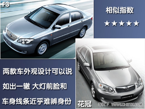 第一眼看到这两款车放在一起的时候,如果不通过车标来辨认,真的很难辨别出两款车谁是谁。比亚迪效仿的功力的确很高,旗下众多车型都或多或少也都对知名车型进行了借鉴,当然也有比较成功的案例。丰田花冠近期刚刚推出了全新改款车型,一些细节设计采用了家族全新理念,不知比亚迪F3是否也有改款的计划。