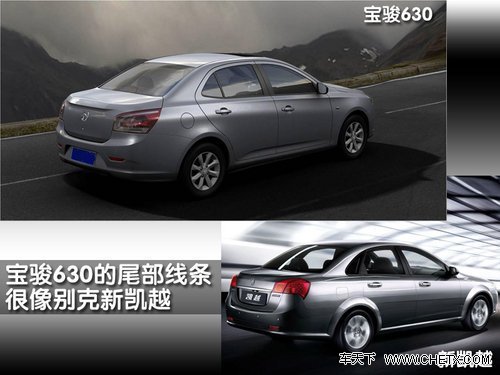 宝骏630(报价 参数 图片 论坛)拥有一条从车头贯穿至车尾的硬派腰线,而且车身两侧的裙边和前后保险杠都采用空气动力学设计,运动气息比较浓厚。从以上的对比图中可以明显发现,宝骏630与新凯越(报价 参数 图片 论坛)的尾部线条设计也有几分相似。但宝骏630的C柱明显经过加高处理,可以更好的提高后排的头部乘坐空间。