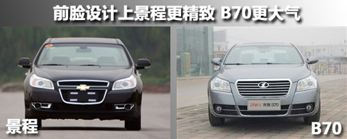 2011款景程前脸多处运用镀铬装饰条点缀,一张“大嘴”镶着金领结,头灯向两侧翼子板做了延伸,配合那张大嘴,非常个性精致。而2010款的B70家族式宽大格栅由老款的3条幅改为5条幅,使前脸更加丰满,直观感觉比景程要大气稳重,商务气息更浓一些。前脸配置上,景程豪华版带有自动雨刷;B70全系并不配有自动雨刷。前灯两者均为卤素灯。